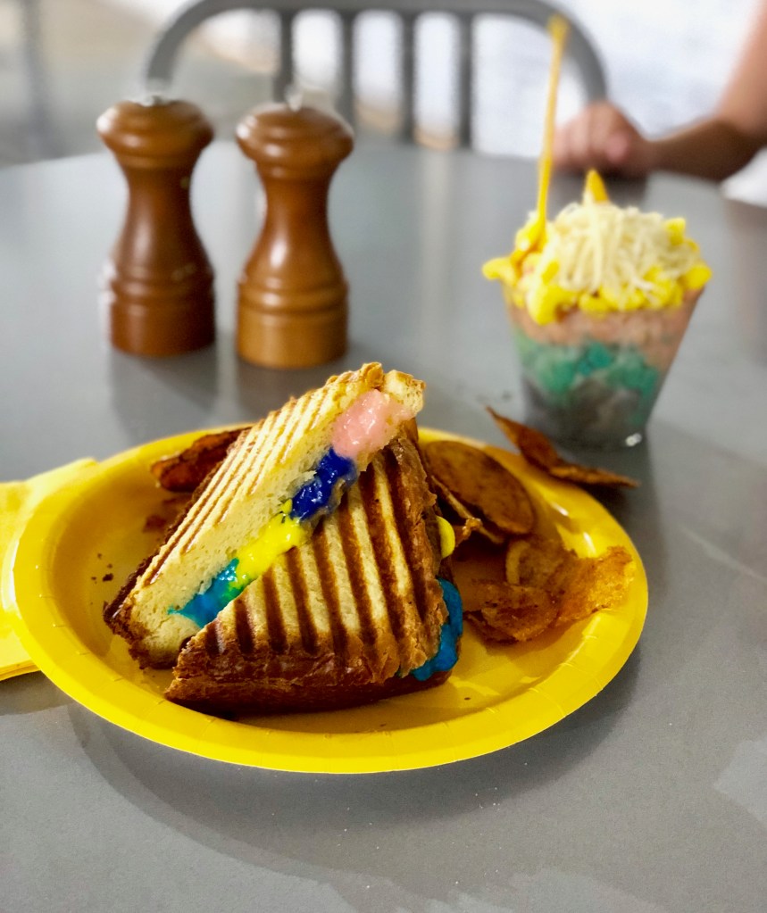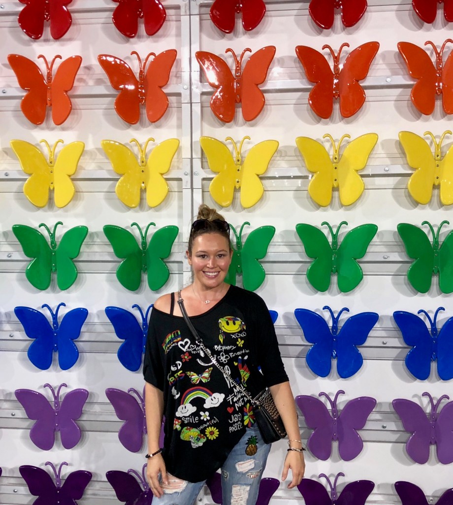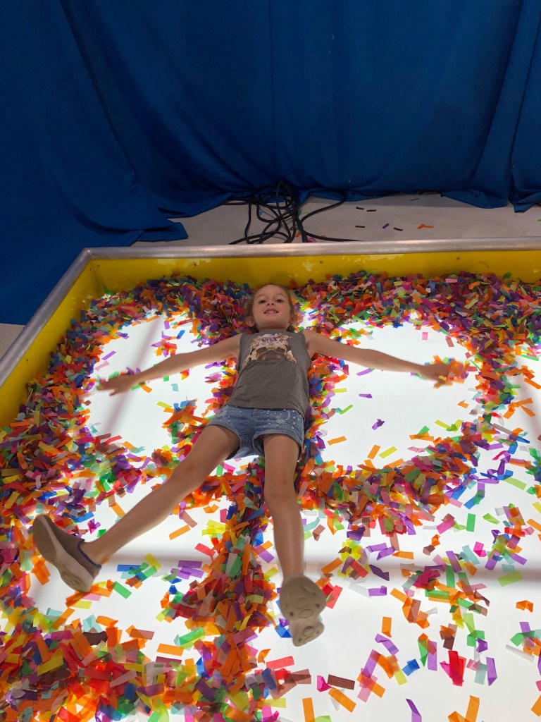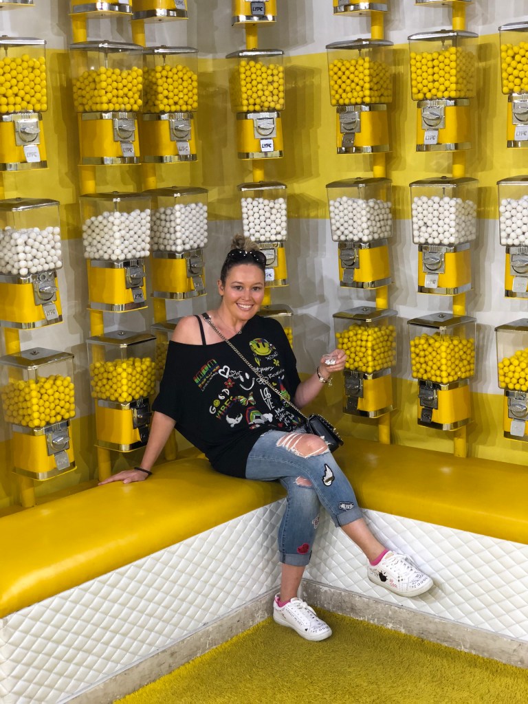 Upon entry, we were greeted with a television that happily goes through the rules of the road. Then we walked into a hallway with giant letters that included “Be Happy” before entering the first room… with giant yellow heels, M&Ms for snacking and a wall of gumball machines. This is my kinda place! We continued through, finding a series of rooms with themed wallpapers, fun sets (some you could climb on and some you couldn’t) and great photo ops/video opportunities. There were hearts, and flowers, and palm trees and confetti. There were signs, and chains, and tubs and dance parties. And at the end of the main exhibits, there were food stands with unicorn and rainbow Cotton Candy, Mac & Cheese, Grilled Cheese and Chicken and Waffles. We opted to try the Rainbow Grilled Cheese and Unicorn Mac ‘n’ Cheese, and not only were they colorful, the were surprisingly tastier than I anticipated. Around the food section were games of corn hole and croquet that the kids and grownups enjoyed. But even though that was the end, the exhibits weren’t over yet. At the exit, they had a gift shop, a giant rubber ducky, a chalkboard the kids were allowed to write on and a wall of butterflies in addition to cute sayings on the walls saying “Happy Trails To You Until We Meet Again” and “Did We Just Become Best Friends.”