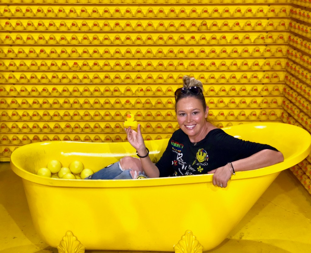 In conclusion, the whole family enjoyed a hop into the ball pit which is documented in Slow Mo on my phone (and on Instagram). We have boomerang videos of the kids pulling balloons attached to the ceiling. We posed with a giant “Happy” sign and got to “hang upside down” in rooms. We hopped in a bathtub surrounded by rubber duckies. We have some great family photos and mother/daughter pics, and everyone was all smiles. But most importantly, we made great memories and got happy together. I recommend checking it out.